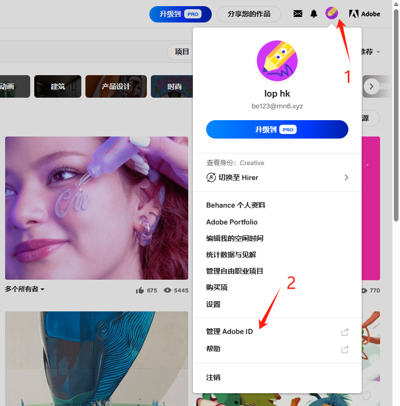 第一步:先登录be后鼠标放到头像点击下面的管理adobe id